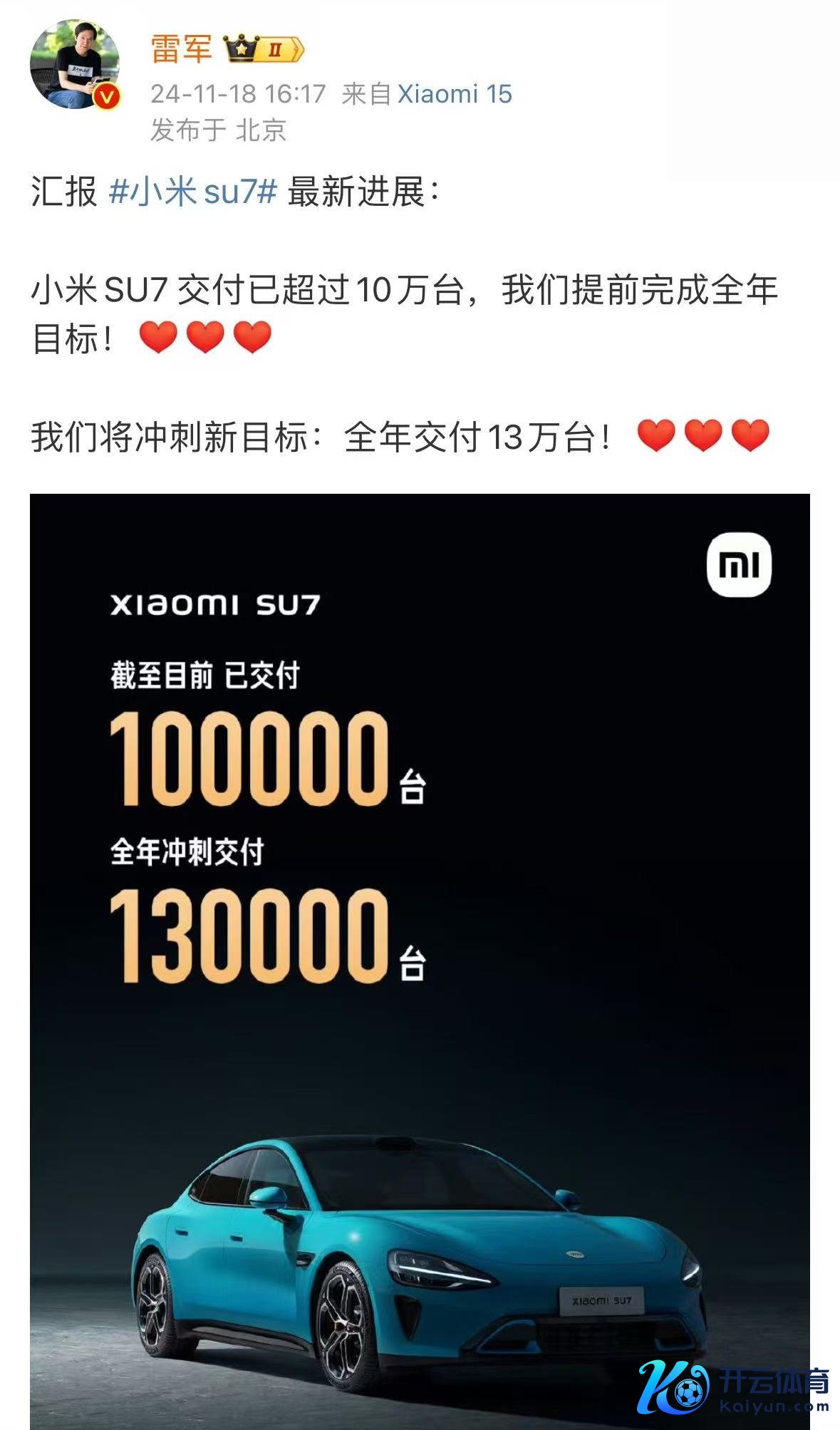雷军:小米SU7 拜托已跳动10万台雷军:小米SU7 拜托已跳动10万台