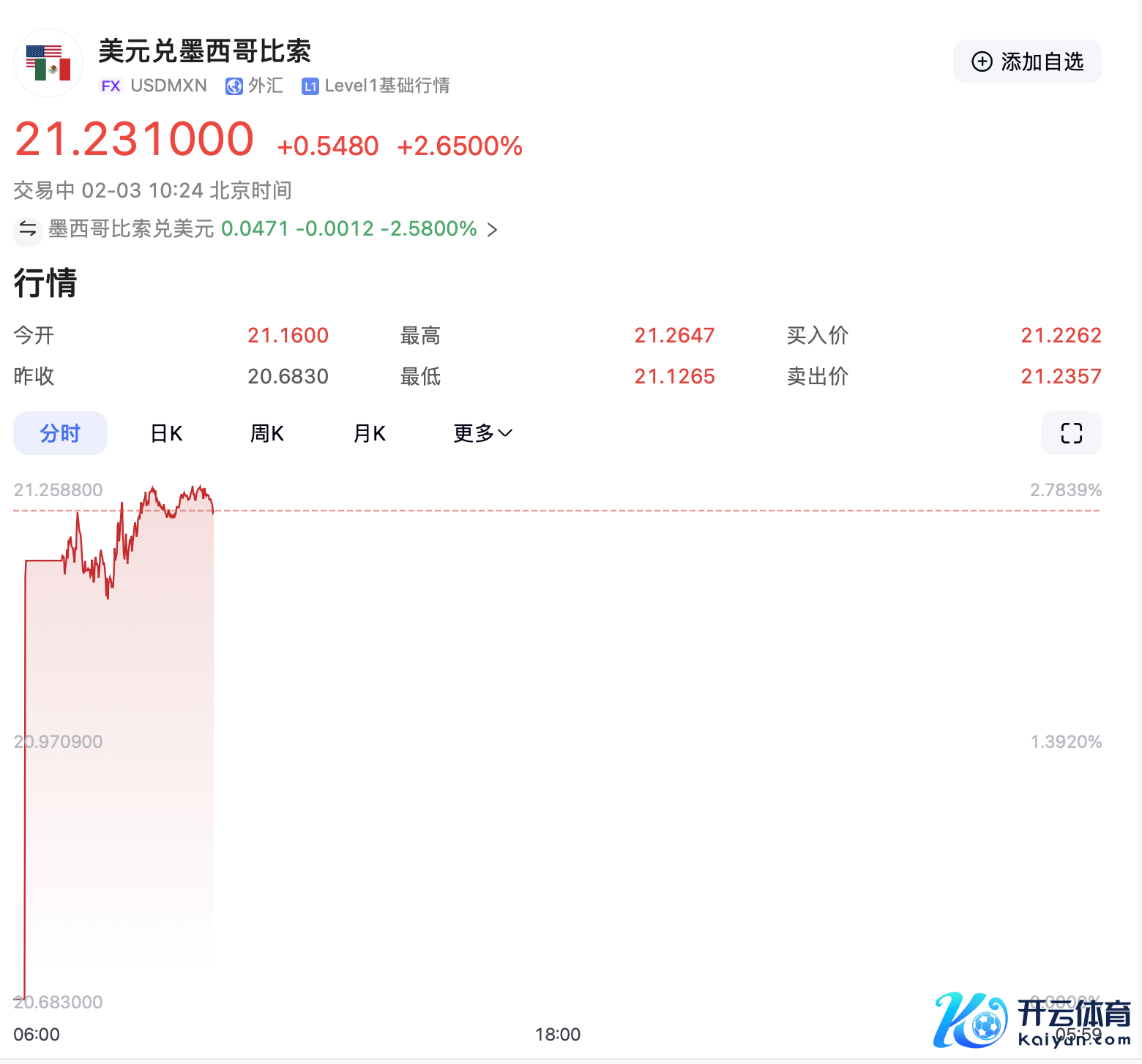 在好意思国布告对墨西哥和加拿大征收25%的关税后,当地本领2月2日,墨西哥比索对好意思元汇率以1好意思元兑换21.21比索开盘,比1月31日收盘时低2.5%。为2022年3月8日以来最低水平。适度发稿,好意思元兑墨西哥比索如图所示:
